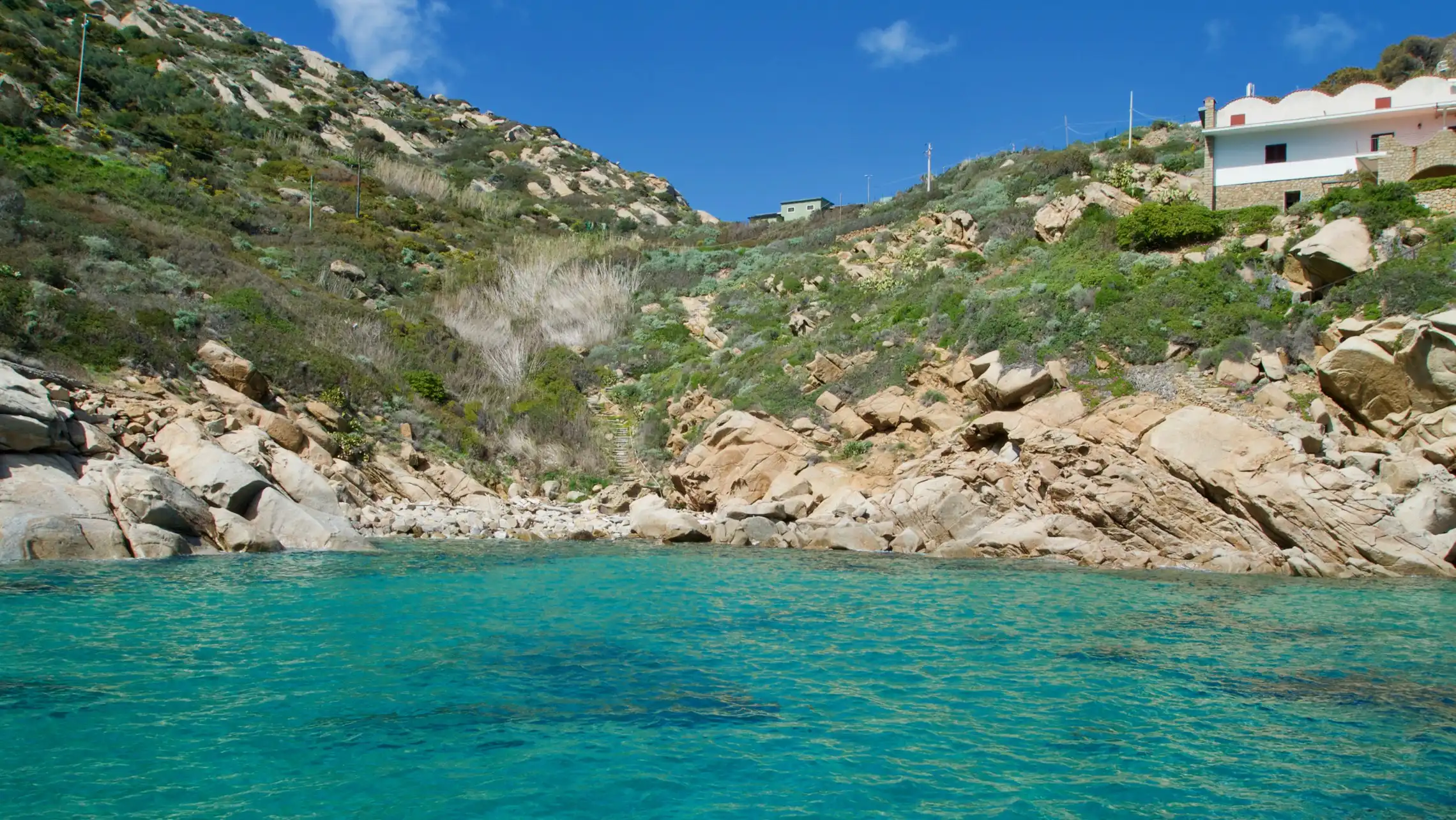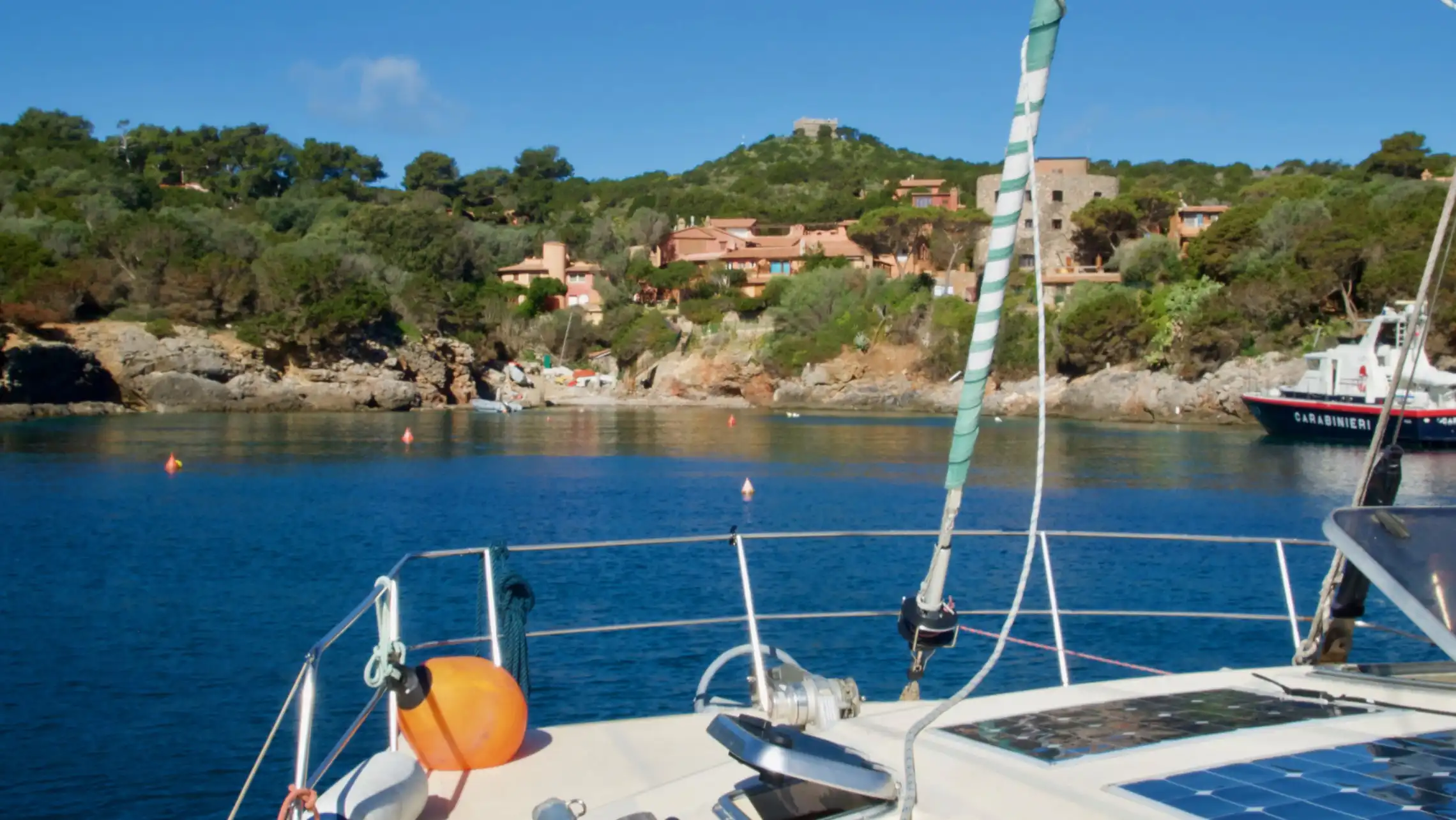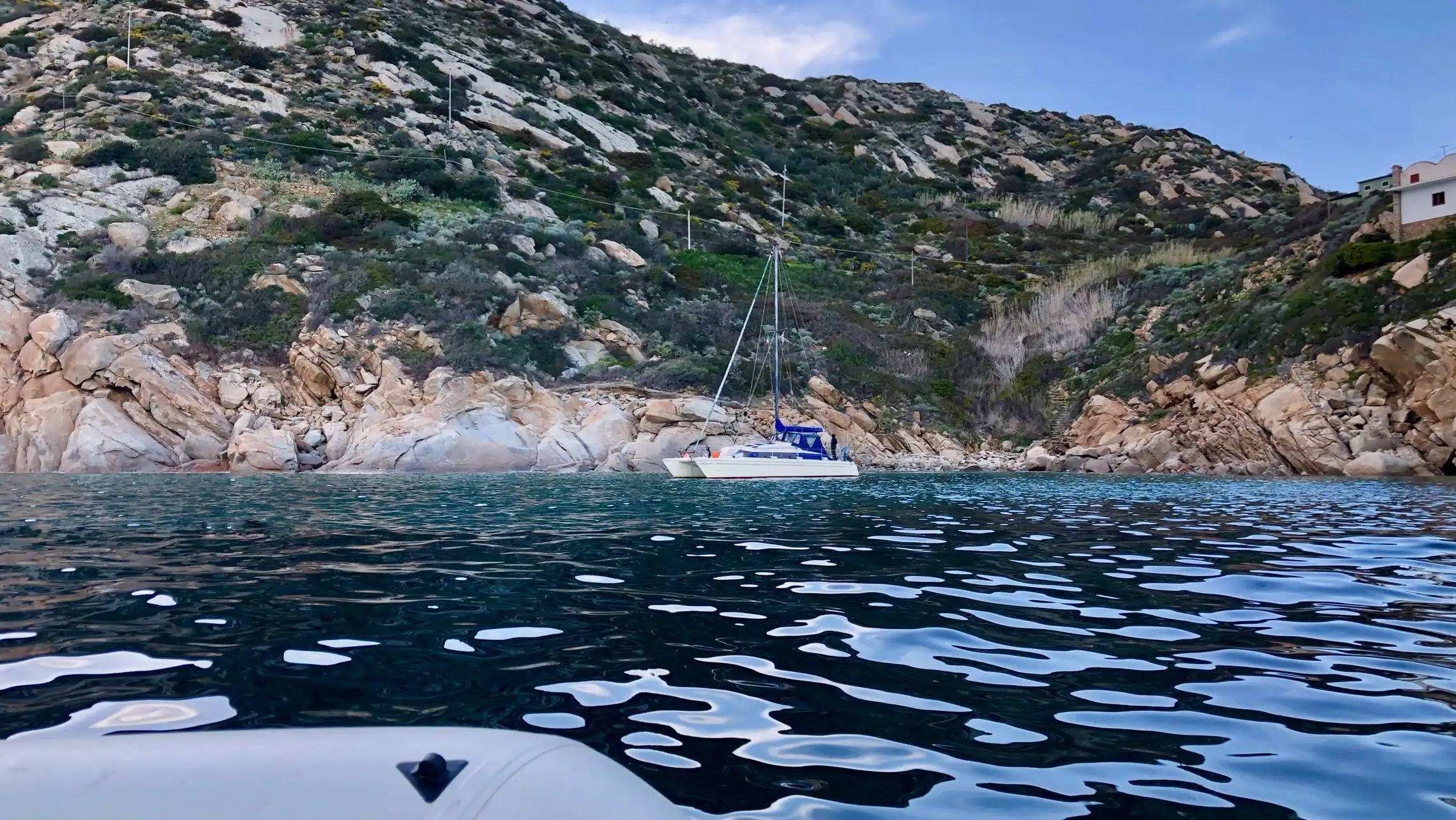 Søndag sejlede vi godt 12 sømil nordpå til en anden og noget større ø, Isola del Giglio. Der var god vind, men også store bølger, så en del af mandskabet på Saga fik at mærke at maven stadig kan rumle. Heldigvis blev det så en kort tur. Ved Giglio kastede vi anker i en lille bugt på østsiden neden for nogle klipper. Det var meget eksotisk med turkist vand og sandbund. Giglio er en meget flot ø med rå natur og høje bjerge. Vi blev på båden for at slappe af. Martin og Sigrid pumpede gummibåden op og tog en kort aftentur ind til en lille, bitte, bitte, lille slags havn hvor man med nød og næppe kan klemme en gummibåd ind. Helt perfekt, da vi bliver her i morgen med og sejler ind for at se på øen.